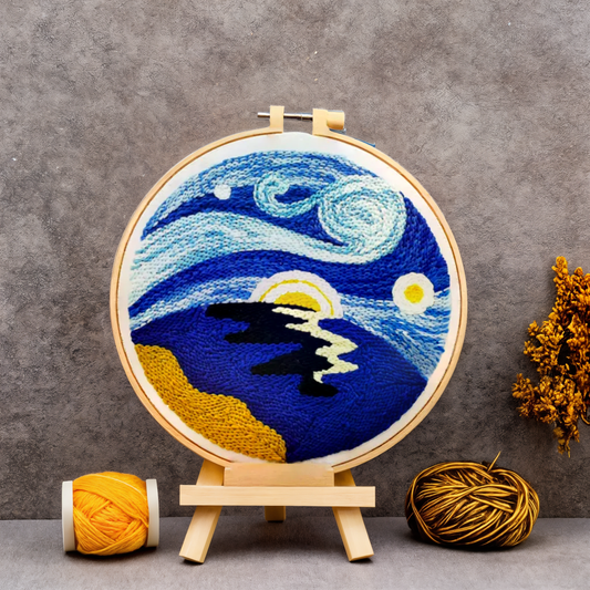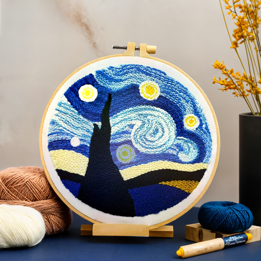 Le Punch Needle (kit d’aiguille de poinçon) est une technique de broderie qui permet de créer des points en relief, tels que des points bouclettes ou agrafes. L'outil principal de ce kit est une aiguille trouée au bout, à travers laquelle passe le fil à broder ou de laine pour créer ces points.